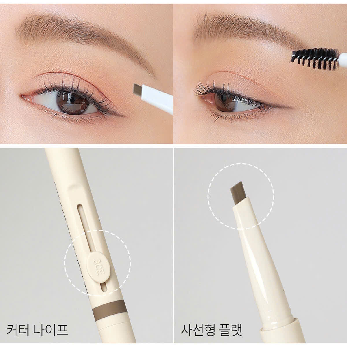 사용방법 : 펜슬로 눈썹 윤곽을 잡은 후 결을 따라서 빈 공간을 채워 줍니다. 스크류 브러쉬로 눈썹의 결을 정돈해 줍니다.
