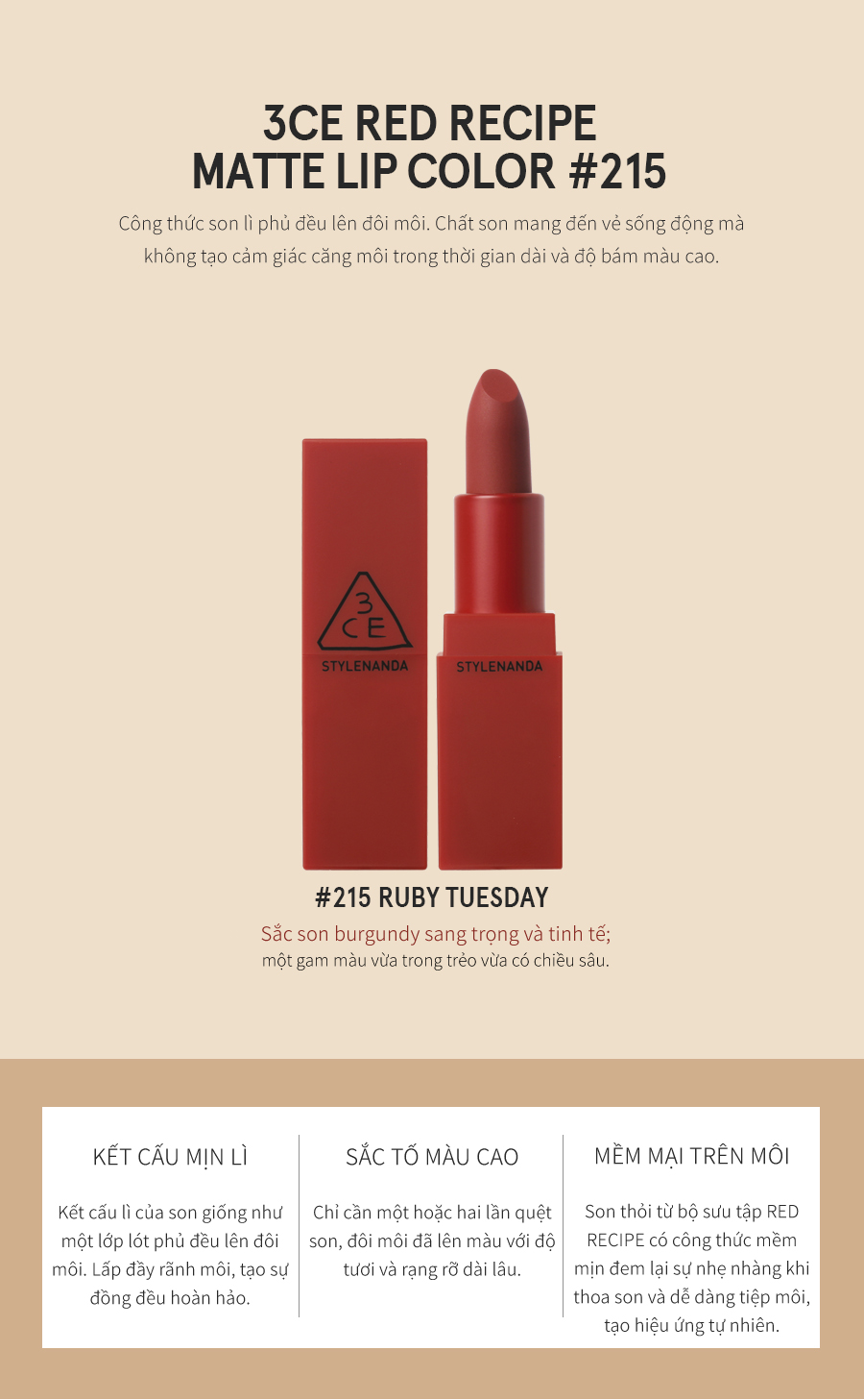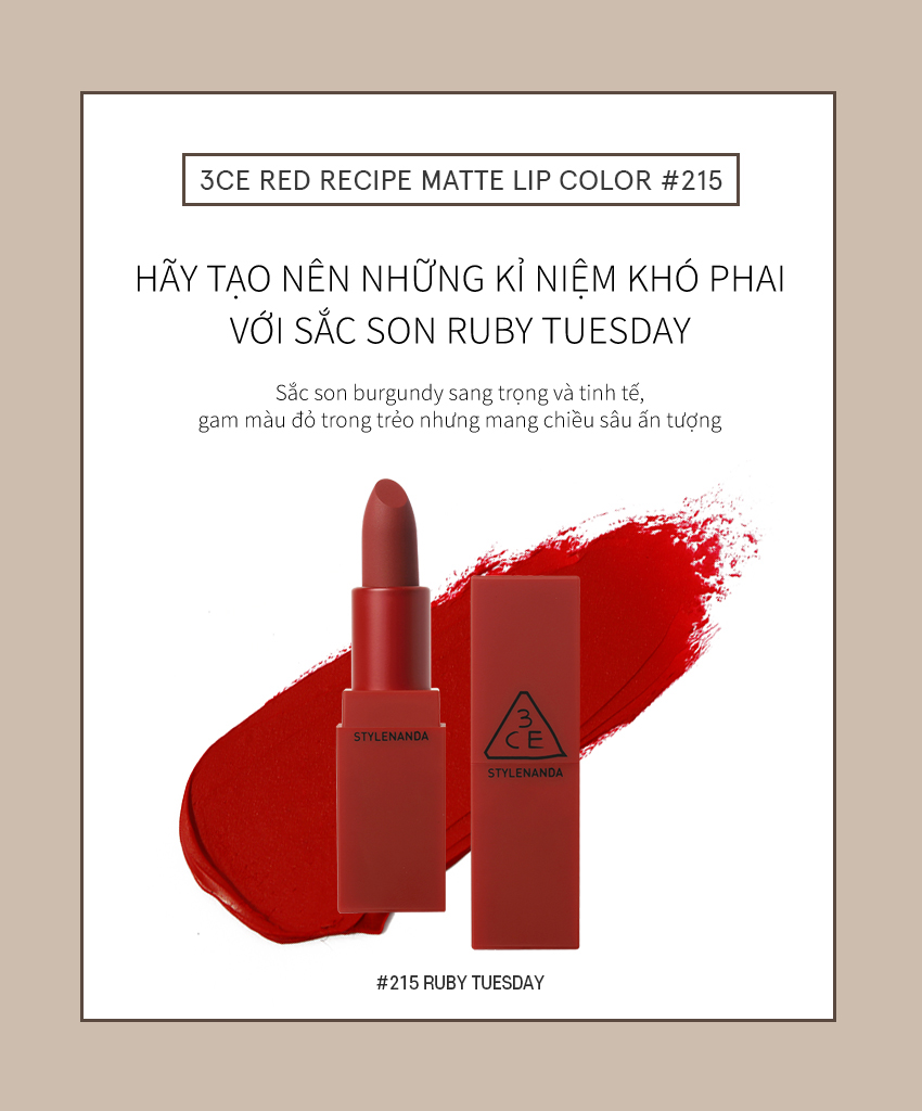 [MATTE] 3CE RED RECIPE LIP COLOR #215 RUBY TUESDAY
