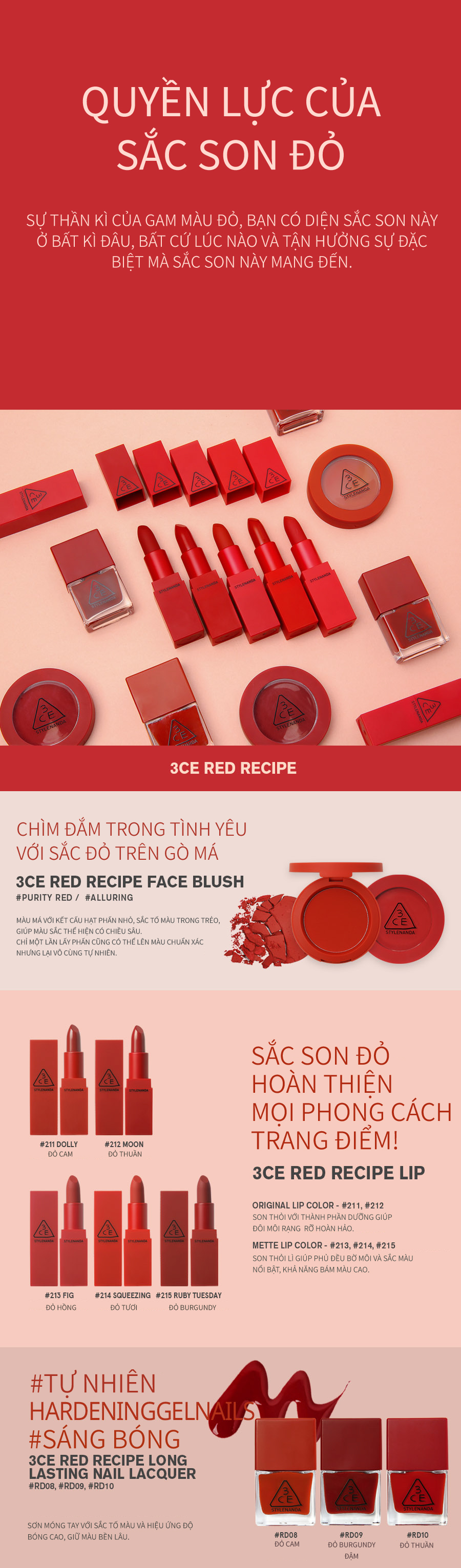 Thuộc bộ sưu tập 3CE RED RECIPE, Son thỏi với kết cấu lì mịn, màu sắc tinh tế.