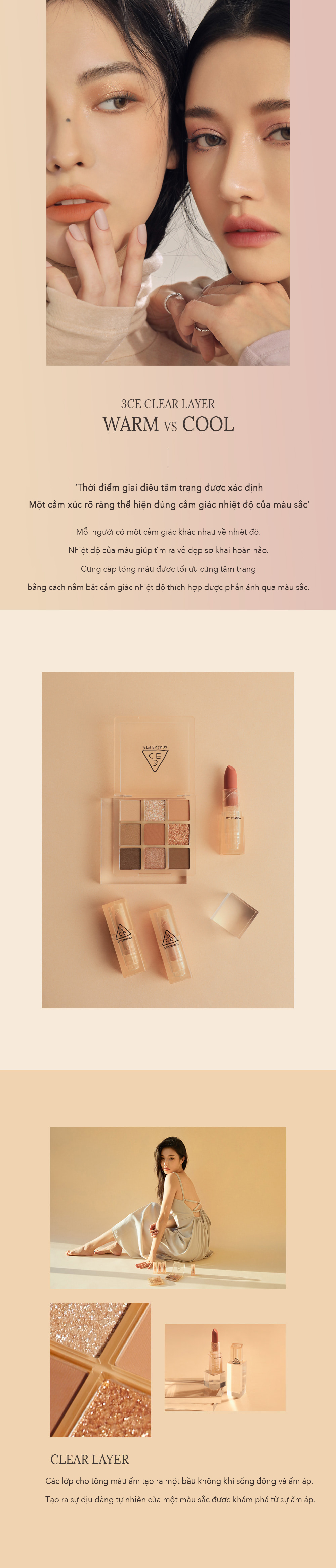 Thuộc bộ sưu tập 3CE CLEAR LAYER WARM AND COOL. Son có sắc tố màu cao và đem lại đôi môi mềm mại dễ chịu.